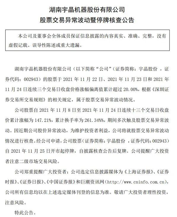11月24日晚间,宇晶股份公告,公司股票自11月8日至11月24日连续十三个交易日收盘价累计涨幅为147.21%,累计换手率为261.34%,期间多次触及股票交易异常波动。因*期公司股价异常波动,为维护投资者利益,公司将就股票交易异常波动情况进行核查。经公司申请,公司股票自11月25日开市起停牌,自披露核查公告后复牌。