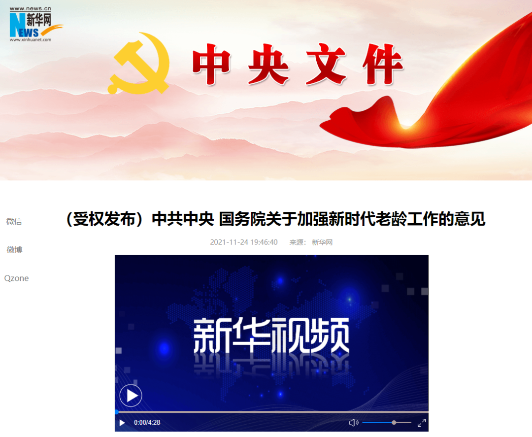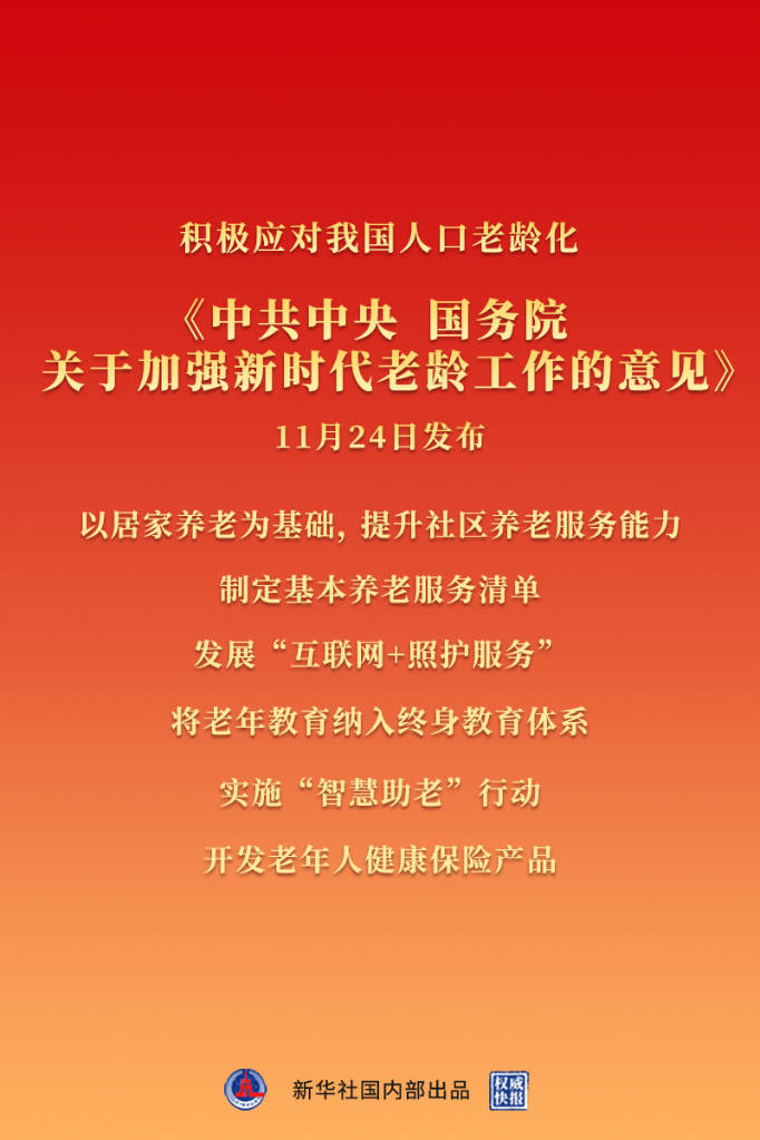 中共*、国务院发布关于加强新时代老龄工作的意见。其中提到,各相关部门要用好有关资金和资源,积极支持老龄工作。
