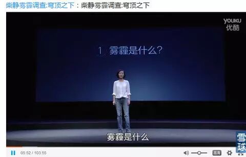 《穹顶之下》全片103分钟,柴静走访多个污染现场寻找雾霾根源,并多国实地拍摄治污经验。这次关于雾霾的调查,被认为“是非机构、非记者所做的信 源最权威、信息最立体、视野最开阔、手段最丰富、最有行动感的雾霾调查”。在此前的交流现场,柴静综合运用当众演讲、现场演示、视频展示和网络传播这四大 手段,剖析了给中国带来严重大气污染的燃煤和燃油存在的四大问题。