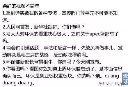 柴静的视频不简单。拿到详实数据做各种专访,宣传部门等事先不可能不知道;人民网首发,新华社跟进。你们懂吗?你造吗?亲。duang duang duang。