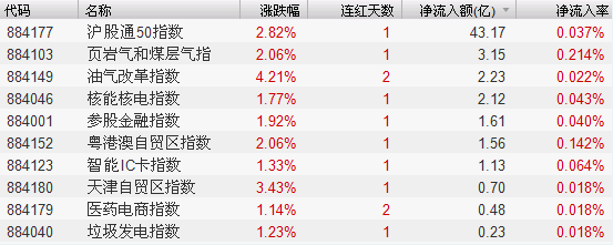 2.页岩气、油气改革和核能核电等板块也在消息的刺激下涨幅居前,资金流入较为明显。