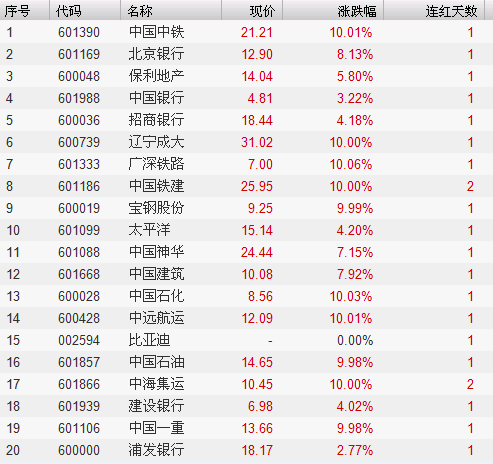 当日资金净流入额前20