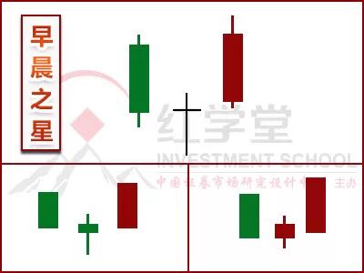 (1)早晨之星一般由三根K线组成,第一根为长阴线,第二根为阴十字星或阳十字星,第三根为大阳线;