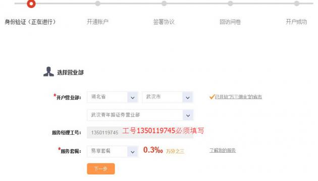 5、新开和转户后面流程一样,登录完之后就到了选择营业部的界面。(建议选择武汉青年路证券营业部自己当地就近营业部,服务经理工号:1350119745 此客户经理10年证券实盘操作经验,8年从业经验,填写此工号可以享受一对一专业服务)