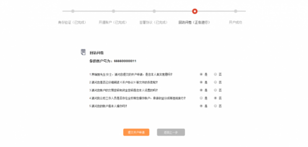 17、回访问卷界面,点击“提交开户申请”,如果你觉得你想修改前面的信息,你可以点击“返回上一步”