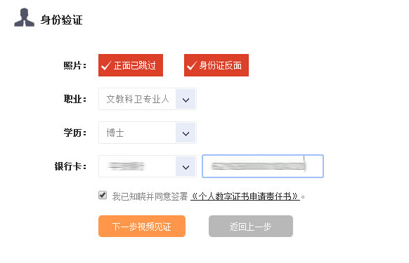 14、下图是视频见证通过,然后点击下一步。如果你觉得你想修改前面的信息,你可以点击“返回上一步”