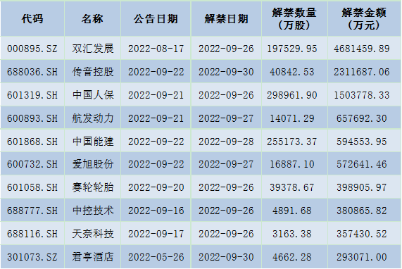 从解禁看,下周将有94只股票面临限售股解禁,合计解禁量为106.59亿股;按最新收盘价计算,合计解禁市值为1503.12亿元。