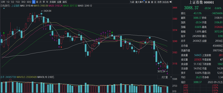 本周(9月19日-9月23日,下同),A股三大股指全线回落。上证指数周跌1.22%,报3088.37点;深证成指周跌2.27%,报11006.41点;创业板指周跌2.68%,报2303.91点。