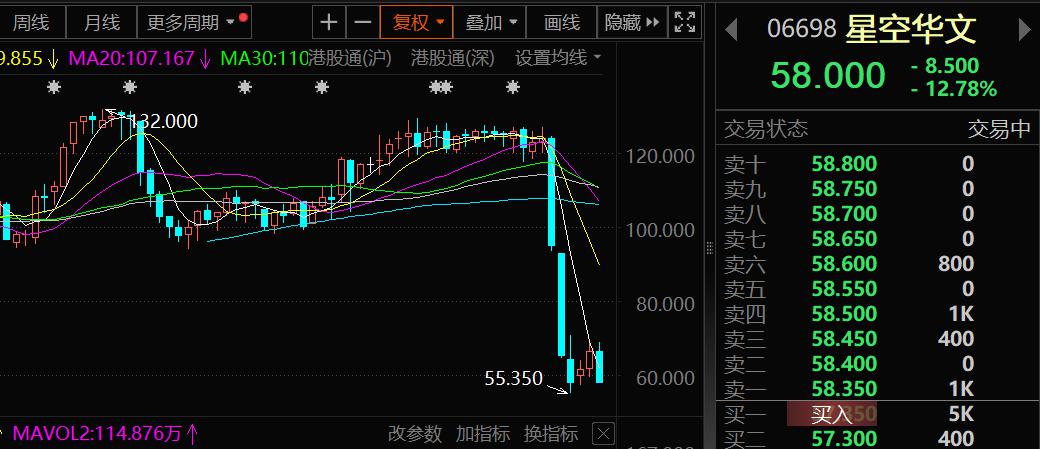 《中国好声音》母公司星空华文股价应声暴跌超10%。此前,该股在李玟事件发酵之后,股价暴跌。8月21日,星空华文股票再次遭遇疯狂抛售,大跌31%,收于65.3港元/股。短短两个交易日,其股价跌去47%,市值蒸发234亿港元。