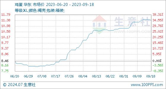 9月18日,生意社鸡蛋基准价为11.45元/公斤,与本月初(10.82元/公斤)相比,上涨了5.82%。