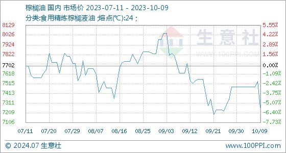 10月9日,生意社棕榈油基准价为7538.00元/吨,与本月初(7480.00元/吨)相比,上涨了0.78%。