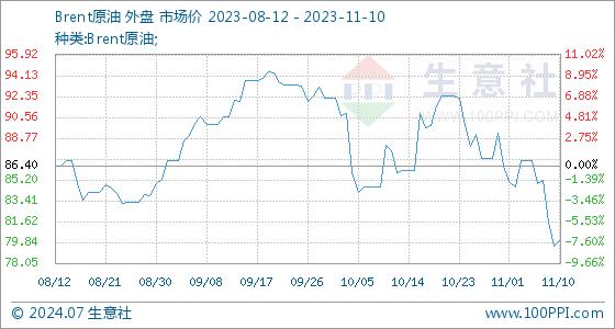 11月10日,生意社Brent原油基准价为79.54美元/桶,与本月初(86.35美元/桶)相比,下降了-7.89%。