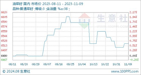 11月9日,生意社油菜籽基准价为6520.00元/吨,与本月初(6508.00元/吨)相比,上涨了0.18%。