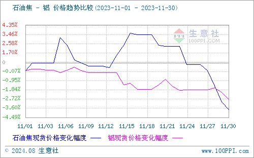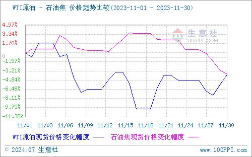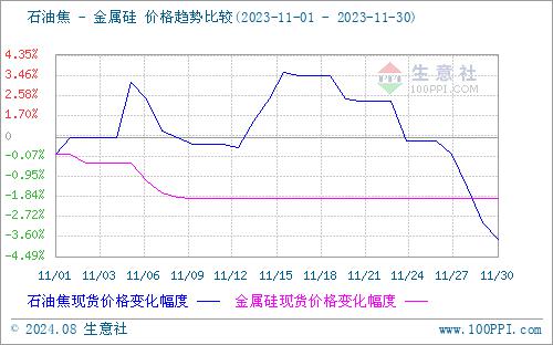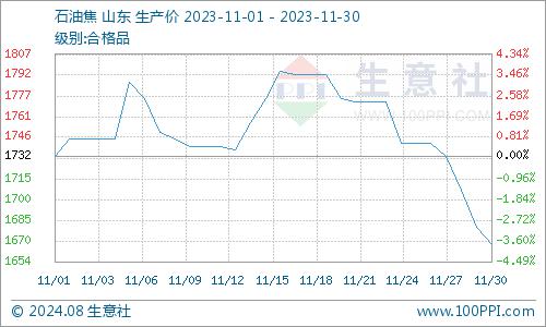 据生意社商品分析系统显示,截止到11月30日山东市场地炼石油焦价格为1667.50元/吨,较11月23日1772.50元/吨下跌5.92%。
