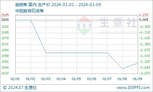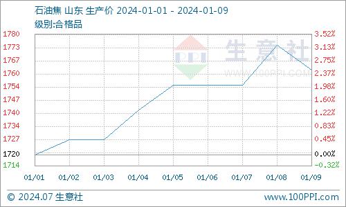 据生意社商品分析系统显示,节后地炼石油焦价格整体上涨,截止到1月9日山东市场地炼石油焦价格为1762.50元/吨,较1月1日1720.00元/吨上涨2.47%。