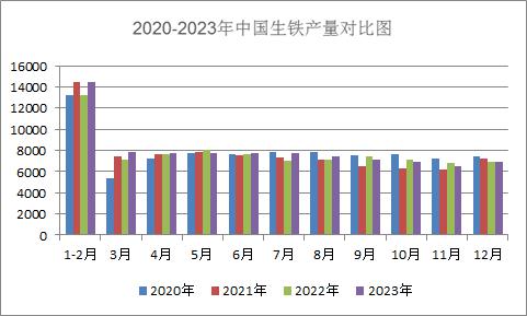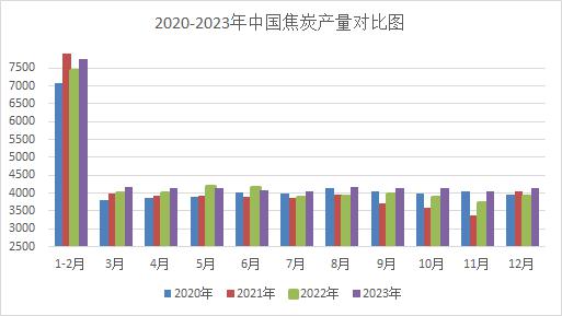目前焦化企业的开工情况受外部影响较小,焦炭的实际产量与产能的关联较低,目前开工率主要跟随焦化企业自身盈利情况进行波动。从以上2022至今焦企开工率变化图可以很直观的感受到,焦企目前对于开工率的调整还是非常频繁的,但整体还是在70%-80%内的区间内进行调整,幅度不会太大,尤其是对待减产比较慎重。从历年焦炭产量对比图也可以比较直观的发现2023年焦炭整体生产是比较平稳的,各个月份之间差距不大。主要因为23年钢厂增产积极,对焦炭的需求量一直比较稳定。因此目前焦炭的生产情况还是主要看下游钢厂的需求,焦炭实际产量与钢厂高炉开工情况较为关联。据国家统计局数据最新数据显示2023年焦炭产量49260万吨,同比增长3.6%,目前焦炭供应整体比较稳定,预计24年在没有明显外部因素影响下,焦炭的供应量也将偏稳。