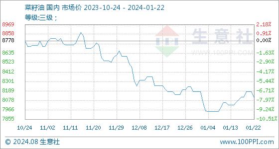 1月22日,生意社菜籽油基准价为8180.00元/吨,与本月初持平。