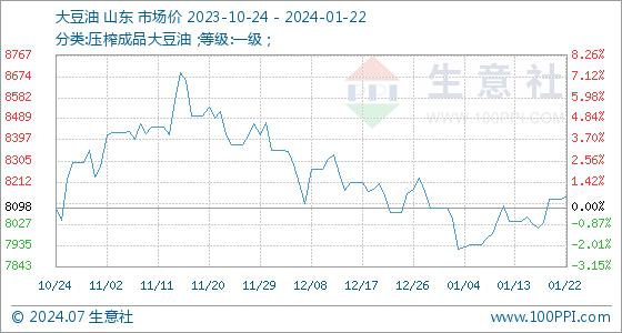 1月22日,生意社大豆油基准价为8136.00元/吨,与本月初(8096.00元/吨)相比,上涨了0.49%。