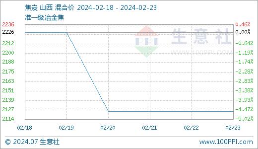 据生意社商品行情分析系统:2024年2月18日至2月23日山西地区焦炭市场第三轮提降落地,截止2月23日准一级冶金焦出厂价格2125元/吨,周期内跌1.57%。