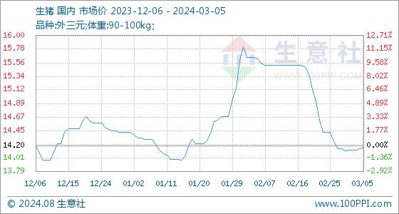 3月5日,生意社生猪基准价为14.15元/公斤,与本月初(14.12元/公斤)相比,上涨了0.21%。