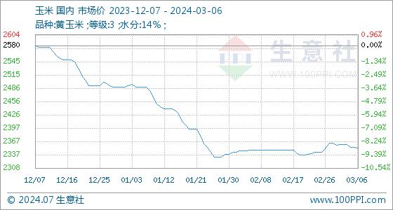 3月6日,生意社玉米基准价为2354.29元/吨,与本月初(2358.57元/吨)相比,下降了-0.18%。