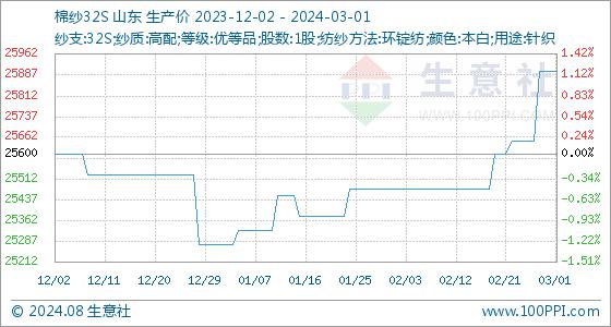 3月1日,生意社棉纱32S基准价为25900.00元/吨,与上月初(25475.00元/吨)相比,上涨了1.67%。