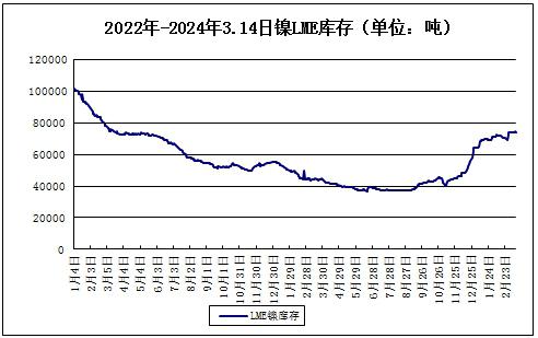 如上图所示,LME镍库存近期小幅回升,截止周末LME镍库存74178吨,较2月初上涨4.26%。