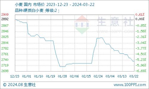 据生意社商品行情分析系统,本周国内小麦市场价格持续偏弱运行。周初均价2748.00元/吨,周末均价2736.00元/吨,小幅下跌0.44%。