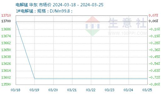 据生意社商品行情分析系统:本周(3月18日至3月25日)1#电解锰市场偏弱运行,华东地区市场价格3月25日价格在13600元/吨,跌0.73%。