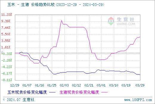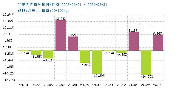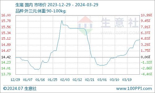 据生意社商品行情分析系统,2024年3月份国内外三元生猪价格持续回升,3月1日均价14.13元/公斤,3月29日均价15.10/公斤,月内上涨6.86%。