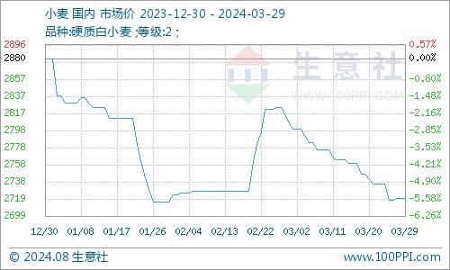 据生意社商品行情分析系统,2024年3月国内小麦市场价格整体震荡下行。3月1日均价2800.00元/吨,3月29日均价2720.00元/吨,月内下跌2.86%。