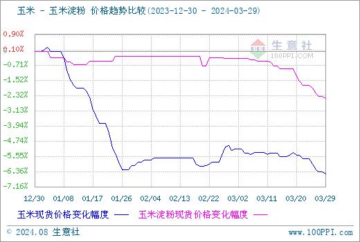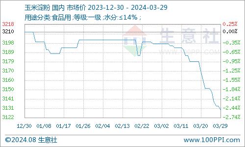 据生意社商品行情分析系统,2024年3月国内玉米淀粉价格弱势下行,3月1日食用一级玉米淀粉均价为3198.00元/吨,3月29日均价为3130.00元/吨,月内下跌2.13%。