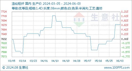 6月3日,生意社涤纶短纤基准价为7682.00元/吨,与本月初持平。