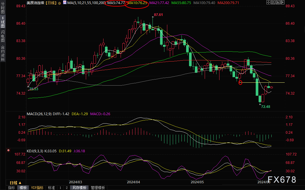 从技术面来看,日线级别,5月24日低点76.15已经转化为强阻力位所在,上周五油价反弹受阻于该位置附近,需要提防油价重回跌势的可能性,5日均线支撑在74.77附近,如果失守该支撑,则增加后市下行风险。