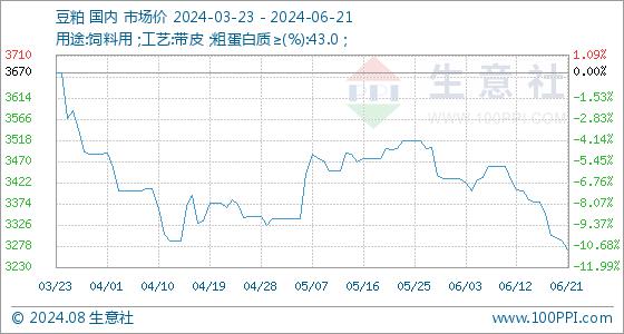 6月21日,生意社豆粕基准价为3290.00元/吨,与本月初(3430.00元/吨)相比,下降了-4.08%。