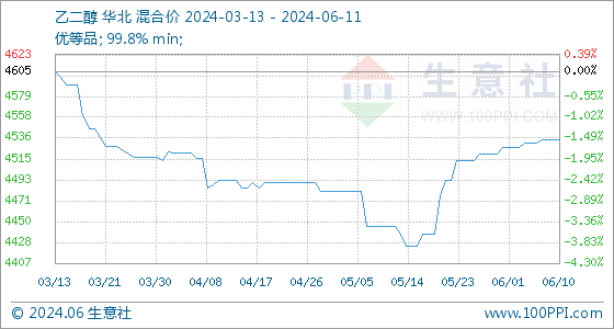 6月11日生意社乙二醇基准价为4535.00元/吨