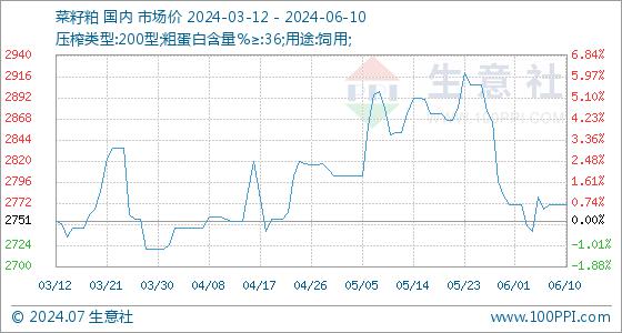 6月10日,生意社菜籽粕基准价为2770.00元/吨,与本月初持平。
