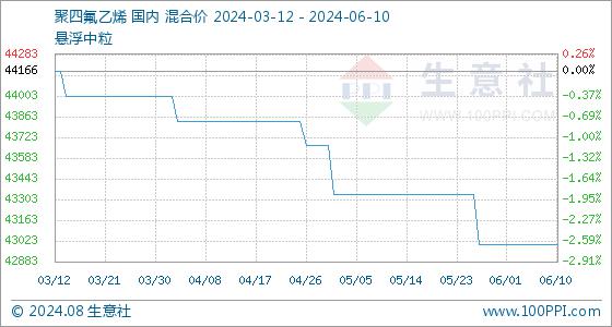 6月10日,生意社聚四氟乙烯基准价为43000.00元/吨,与本月初持平。