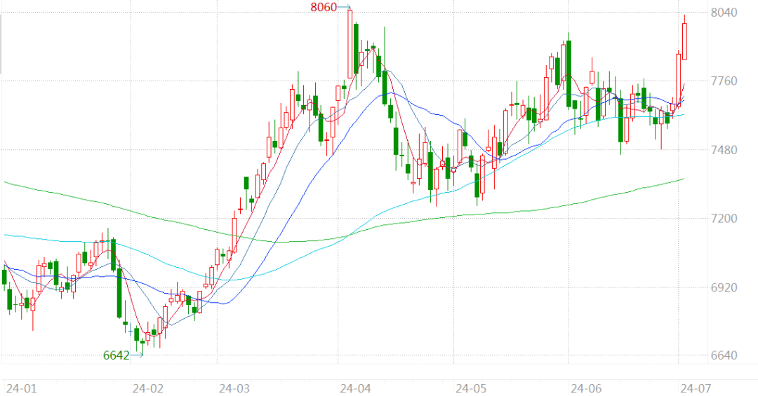 内盘6月24日-7月1日,棕榈油2409合约先抑后扬,开盘7654元/吨,最高至7886元/吨,最低7480元/吨,收至7868元/吨,较前一周涨3%。
