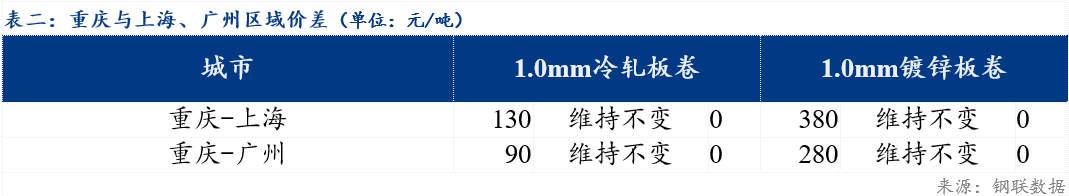 重庆、上海地区冷轧板卷区域价差维持不变;重庆、广州冷轧板卷区域价差维持不变。重庆、上海镀锌板卷区域价差维持不变;重庆、广州镀锌板卷区域价差维持不变。镀锌、冷轧品种价差维持不变;镀锌、热轧品种价差缩小10元/吨;冷轧、热轧品种价缩小10元/吨。