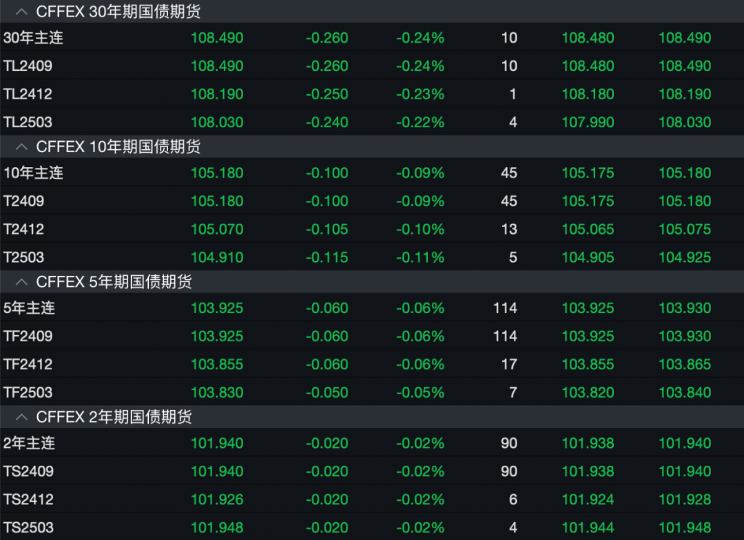 该消息发布后,国债期货应声下跌。数据显示,截至10:15,国债期货全线飘绿。30年期国债期货主力合约跌0.25%,10年期主力合约跌0.10%,5年期、2年期主力合约跌0.06%、0.02%。