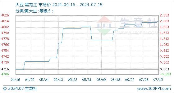 7月15日,生意社大豆基准价为4812.00元/吨,与本月初(4808.00元/吨)相比,上涨了0.08%。