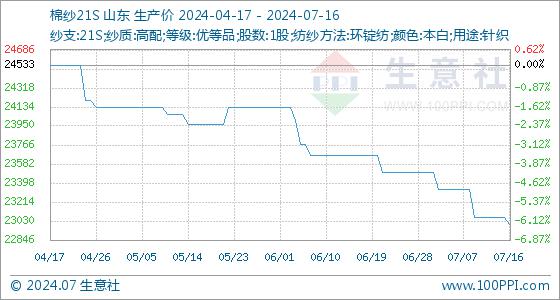 7月16日,生意社棉纱21S基准价为23066.67元/吨,与本月初(23500.00元/吨)相比,下降了-1.84%。