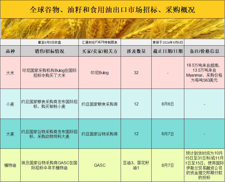 全球谷物、油籽和食用油出口市场也呈现出新的动态。印尼国家采购机构Bulog在国际招标中购买了约32万吨大米,这一大规模采购行为可能会对全球谷物市场产生影响。此外,埃及商品供应总局(GASC)正在国际招标中寻求植物油,预计到货时间为10月15日至11月15日,这可能会对豆油市场产生影响。