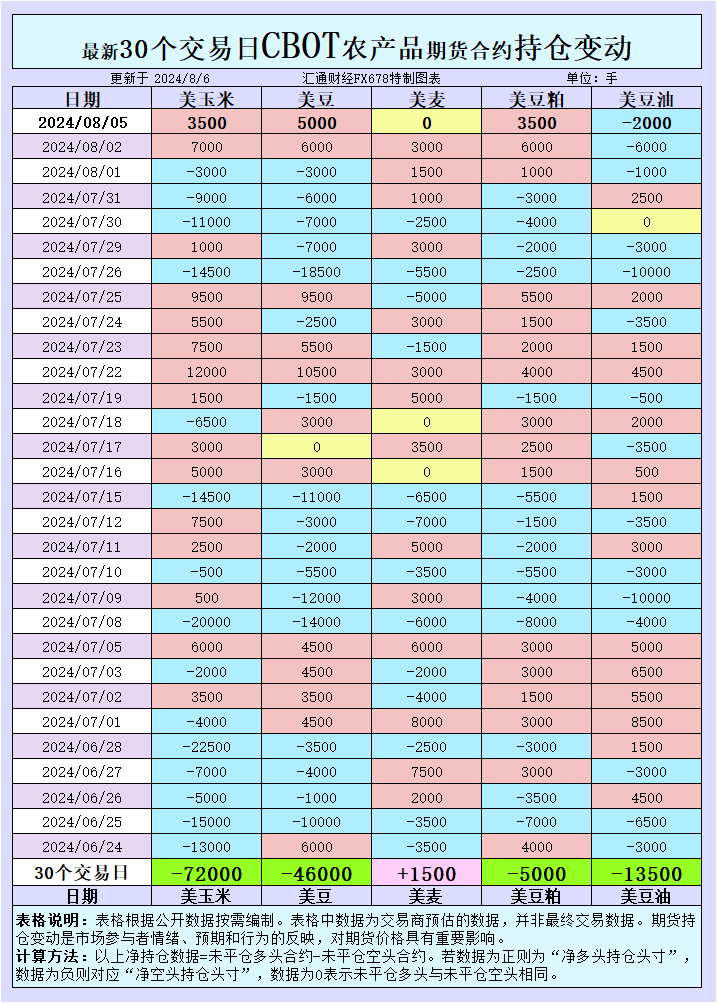 汇通财经APP讯——周二(8月6日)的农产品市场中,玉米、大豆、小麦、豆粕和豆油这五大品种的交易者们迎来了一系列新的市场信息和数据更新。美国农业部的最新报告显示,大豆和玉米的作物状况有所改善,但市场对美国经济衰退的担忧导致玉米和小麦价格承压。