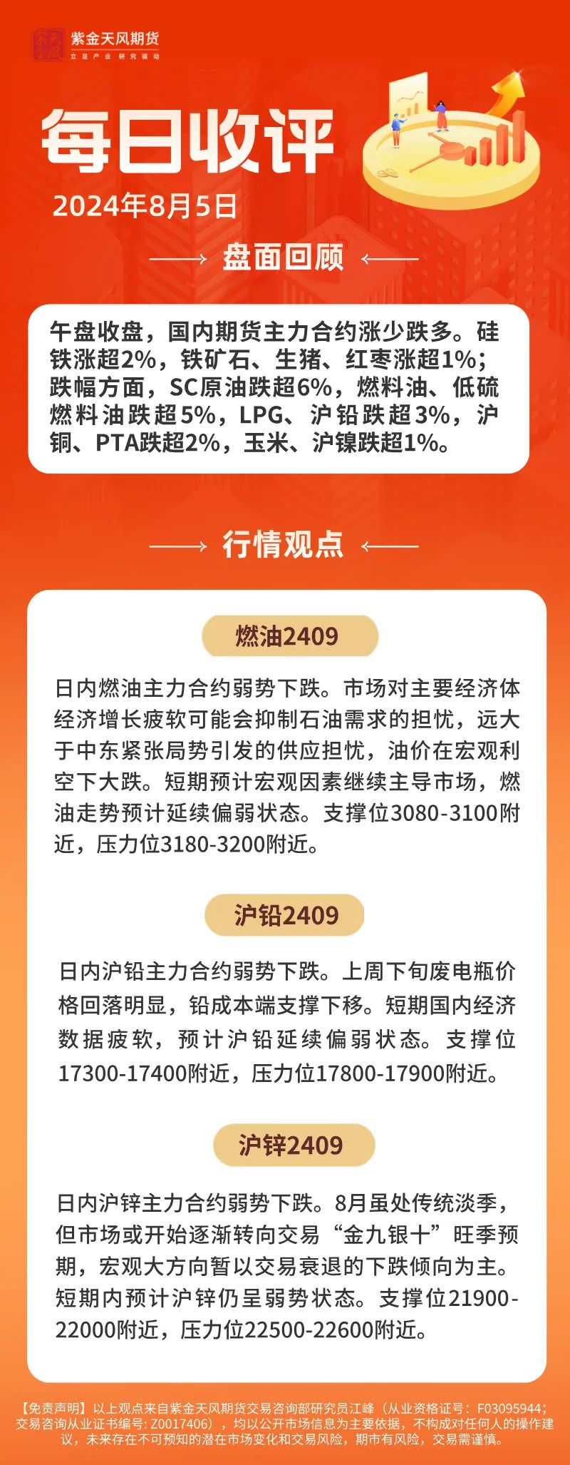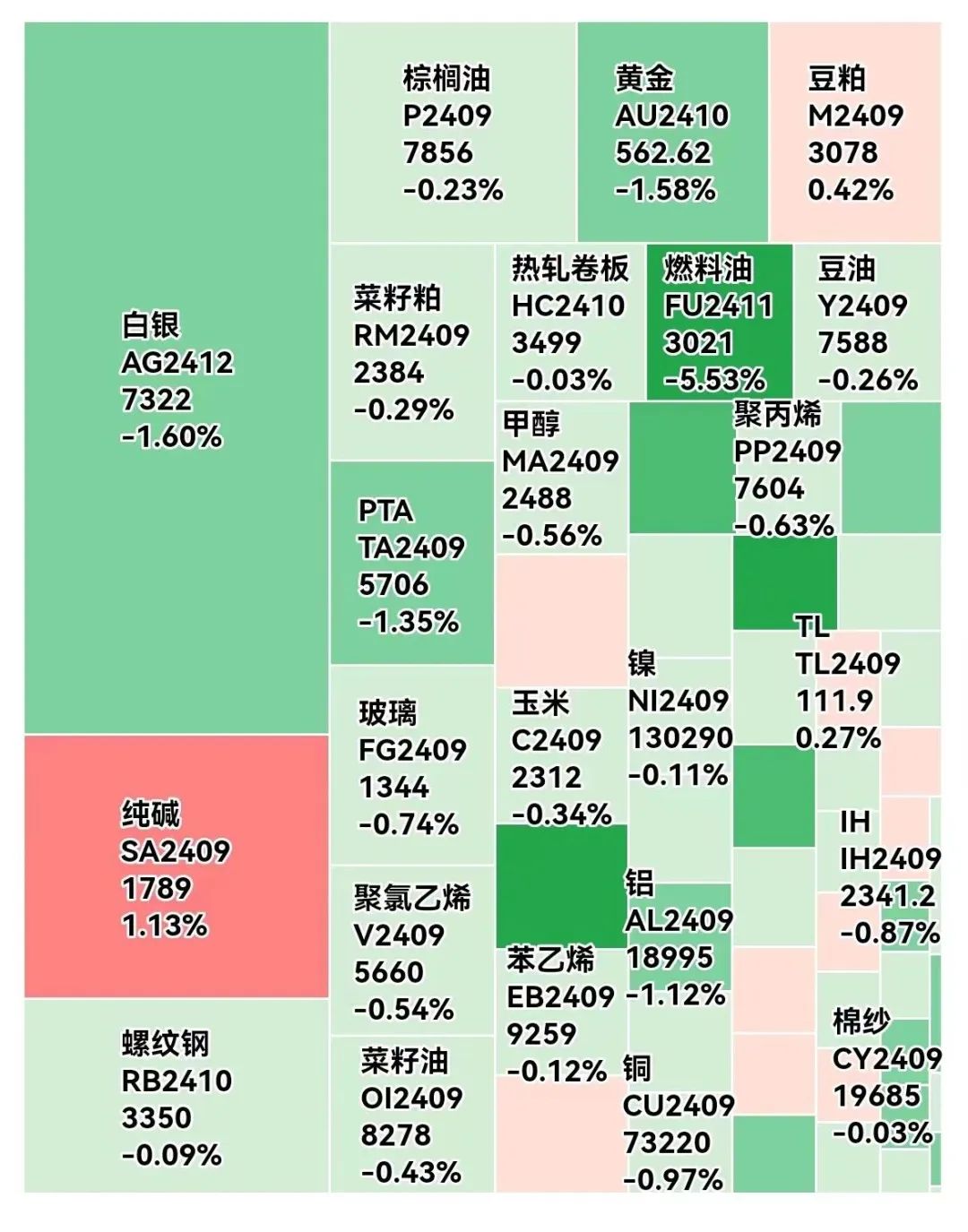 2024年8月5日,今日国内期市整体表现偏弱,石油板块跌幅榜居前,市场空头情绪占优。