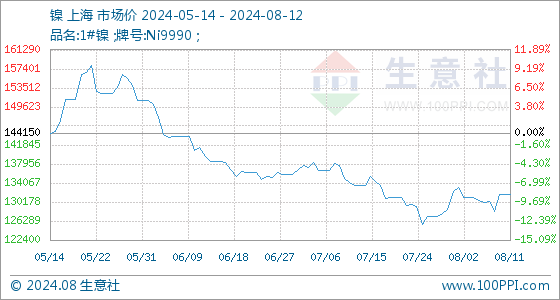 8月12日,生意社镍基准价为131666.67元/吨,与本月初(132350.00元/吨)相比,下降了-0.52%。
