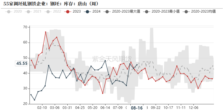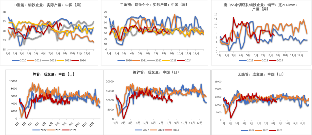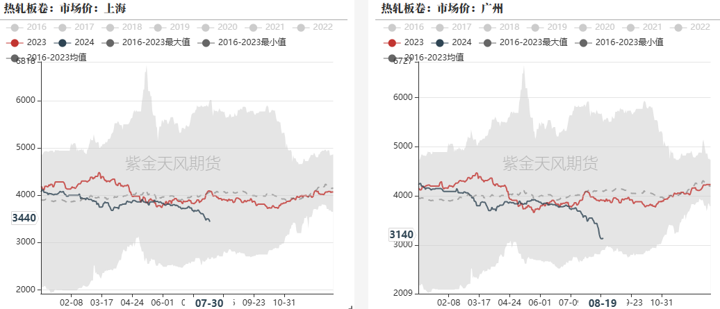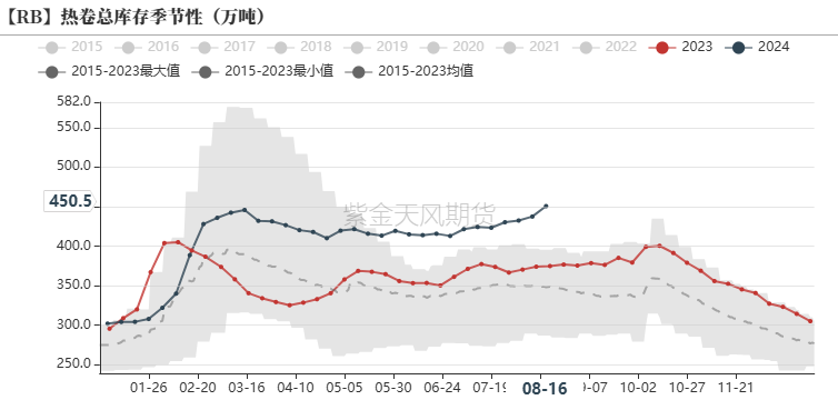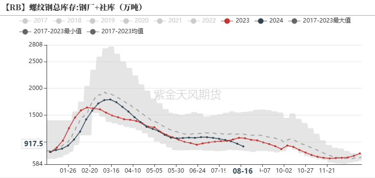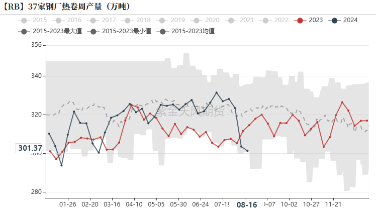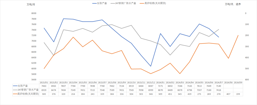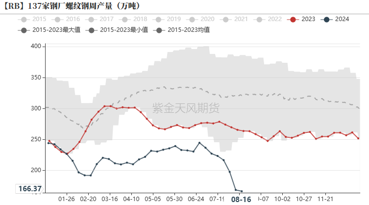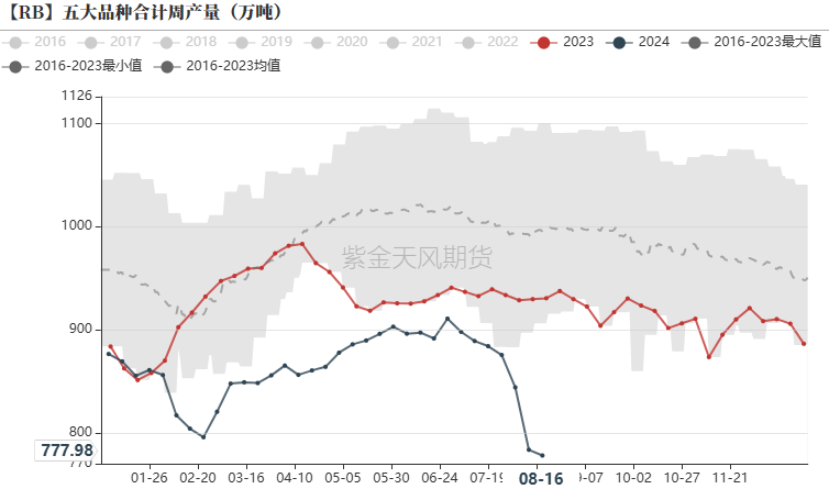 截至2024年8月16日,日均生铁产量为228.77万吨,环比下降2.93万吨(降幅1.26%);相比于去年同期下降6.9%。