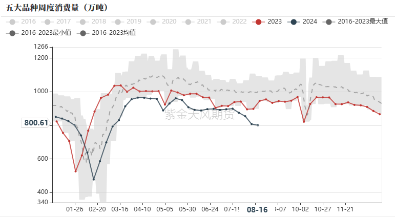 需求方面,本周五大品种消费总量达800.61万吨,环比下降7.68万吨,降幅1.0%,相比于去年同期下降15.4%。