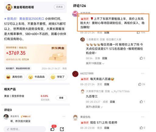“黄金哥哥的哥哥”认为,“金价600+并不远,但‘大黄’不会一直直线上升,一锭是螺旋式的”,建议粉丝不要慌。另一位黄金大V花匠则表示,“上不了车就不要勉强上车,高价上车风险太大,要耐心等待回调到位后,再低价买入,稳当赚钱”。京东金融的投研团队,也提醒投资者提高风险防范意识,合理控制仓位,理性投资。